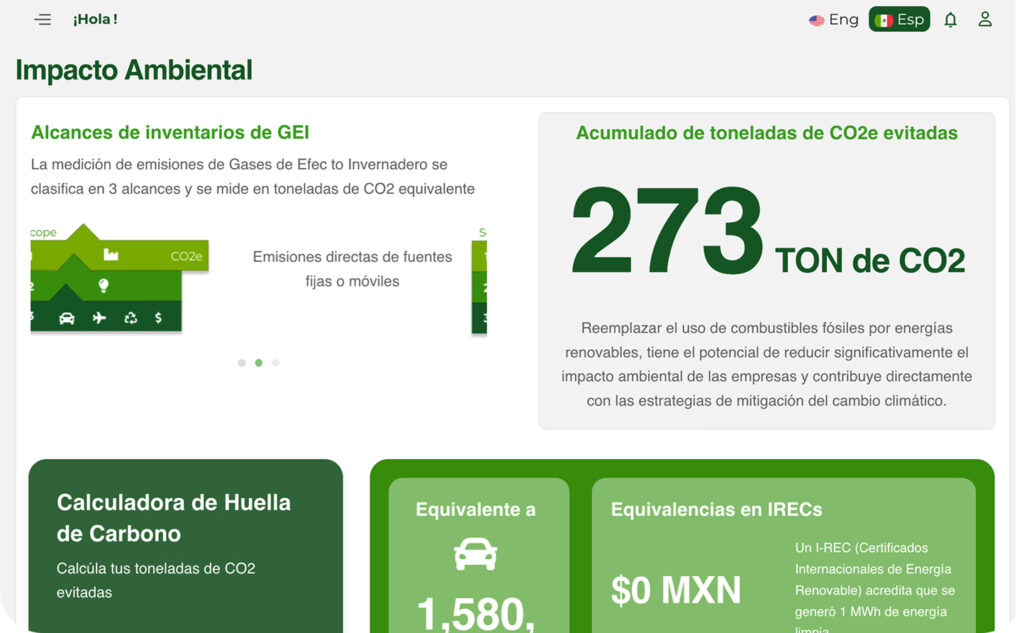 Conoce de manera clara cómo tu consumo y generación de energía impactan al medio ambiente. Mide tus emisiones evitadas, tu aporte en energías limpias y los beneficios que generas para un futuro sostenible